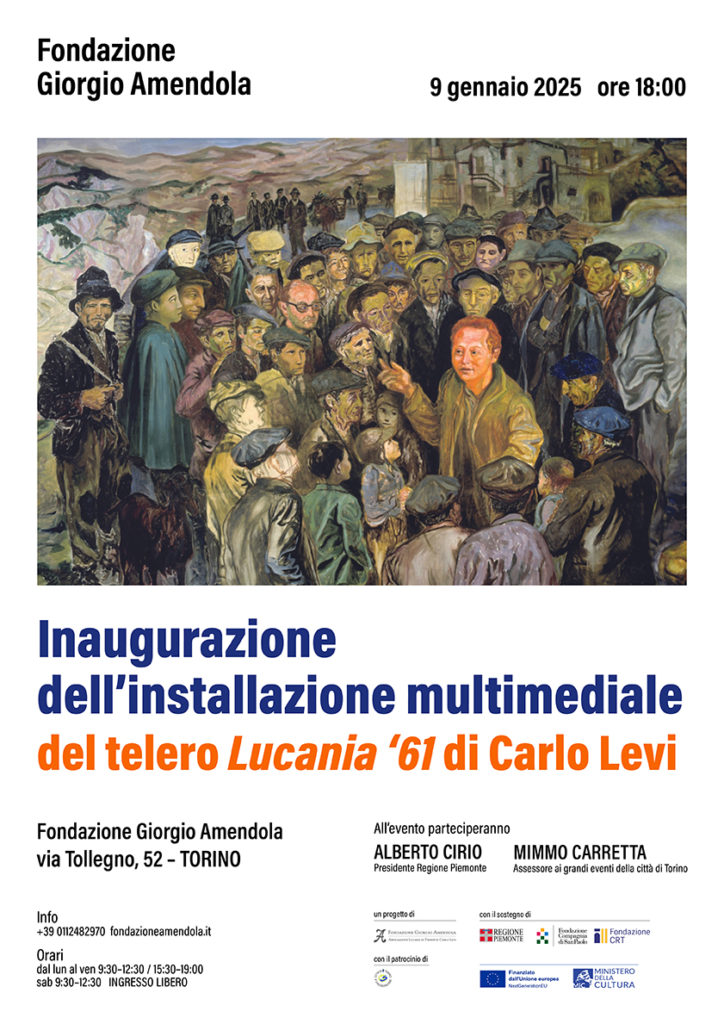 Il 9 gennaio 2025 alle ore 18 in via Tollegno 52, sarà presentata una inedita e unica traduzione del Telero Lucania ‘61 di Carlo Levi, a cinquant’anni dalla sua scomparsa, in formato multimediale realizzata da Olo Creative Farm su commissione della Fondazione Giorgio Amendola, all’interno di un progetto finanziato dall’Unione Europea nell’ambito del PNRR, Next Generation EU.