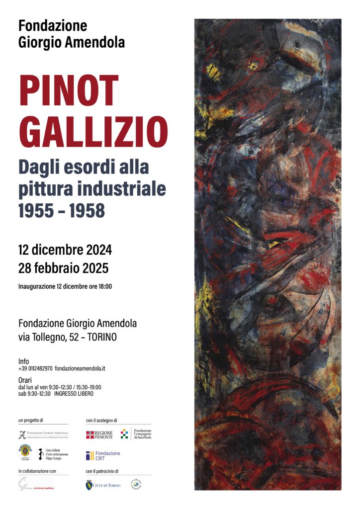 La Fondazione Giorgio Amendola unitamente al Comune di Torre Pellice e alla Civica Galleria Filippo Scroppopresentano la mostra PINOT GALLIZIO. Dagli esordi alla pittura industriale 1955-1958 a cura di Luca Motto. La mostra è in collaborazione con l’Archivio Gallizio di Torino e vede la partecipazione di collezionisti privati e della Galleria del Ponte di Torino.